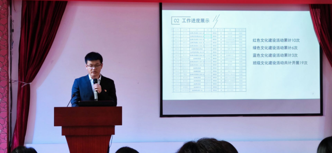 本次活动由学院组织推选出的各年级的五个班级进行班级文化建设评审答辩,最终根据各班级自评报告、活动效果和答辩展示三个环节评选的得分推选出三个学校“红蓝绿”先进班集体。
