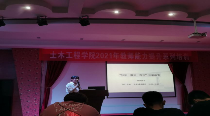 本网讯(文/图 左雨思)2021年5月30日19:30—20:00,19级环境设计专业在土木办公楼3楼多功能厅召开了一场“知法、懂法、守法,争做新时代大学生”的主题班会。