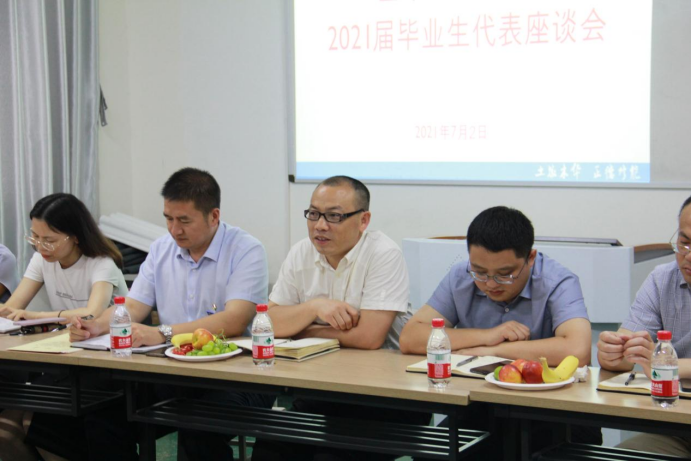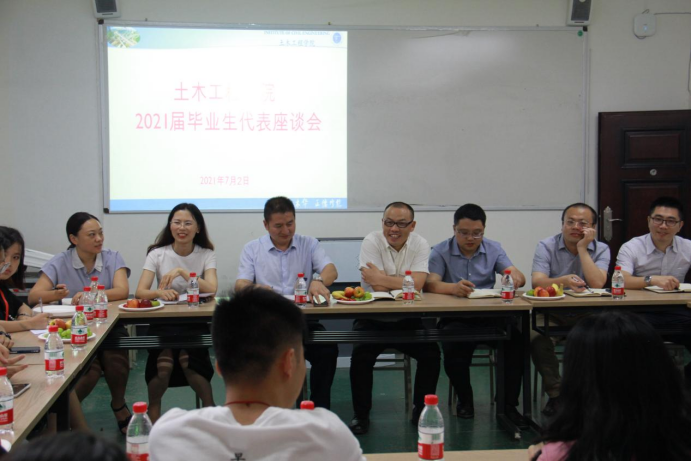 本网讯(文/罗文 图/赵长成)为了更加深入了解大四毕业生的学习和发展情况,加深学院与毕业学生的联系,加强师生情谊,加固构建学校和学生双渠道双赢模式,完善我院教学质量和教学方案。土木工程学院于2021年7月2日13:00在1203教室顺利开展2021届毕业生代表座谈会。土木工程学院院长雷江,党总支书记唐和平,副院长汪金能、朱曲平,系主任安雪玮、符繁荣、朱小利出席与30余毕业生代表进行座谈。