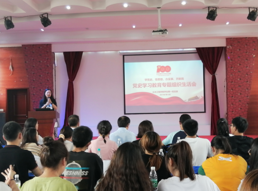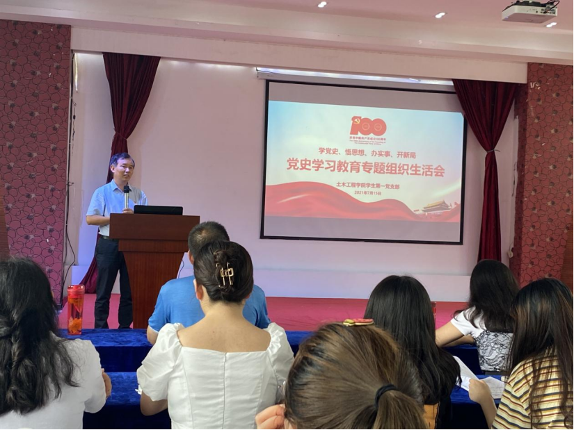 本网讯(文/图 瞿采盈)围绕“学党史、悟思想、办实事、开新局”主题,认真贯彻“学史明理、学史增信、学史崇德、学史力行”要求,土木工程学院学生第一党支部于2021年7月15日12:30—14:45,在土木工程学院办公楼三楼多功能厅开展“党史学习教育专题组织生活会”。校纪委书记兼工会主席唐小勇、土木工程学院党总支副书记唐和平及支部全体党员(预备)同志参加此次组织生活会。