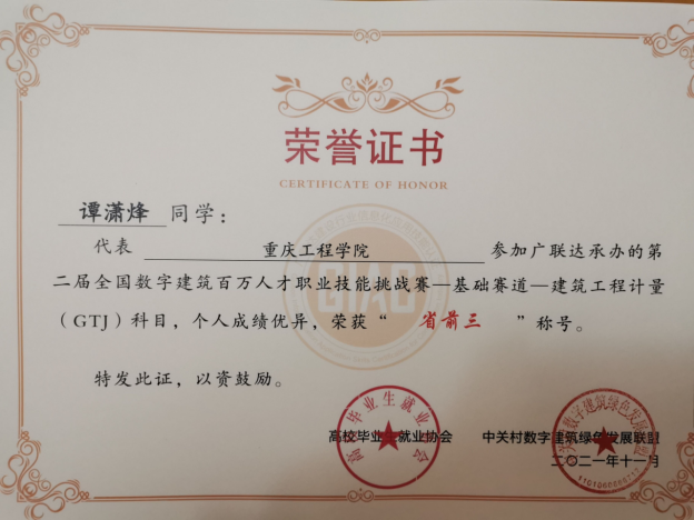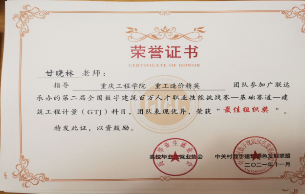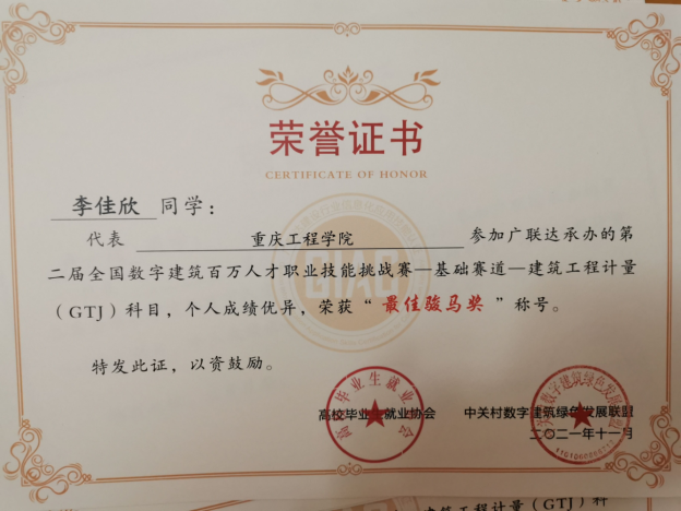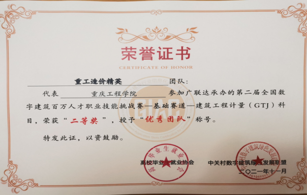 本网讯(文/图 徐玲琳)近期,第二届全国数字建筑百万人才职业技能挑战赛—基础赛道成绩发布,由建筑工程学院工造学子组成的重工造价精英团队在建筑工程计量赛项获团队二等奖及优秀组织奖,谭潇烽同学获个人成绩省前三,李佳欣等16名同学获最佳骏马奖(个人成绩全国排名前10%),团队43名成员全部取得广联达BIM系列软件一级认证证书,比赛指导教师:甘晓林,王红梅,侯广真。同时,工程造价教师指导学生参加第二届“智建杯”智慧建造创新大赛,获铜奖2项,优秀奖3项,参与的指导教师有王红梅、安雪玮、刘香香、甘晓林、曾赟、许欢欢等。