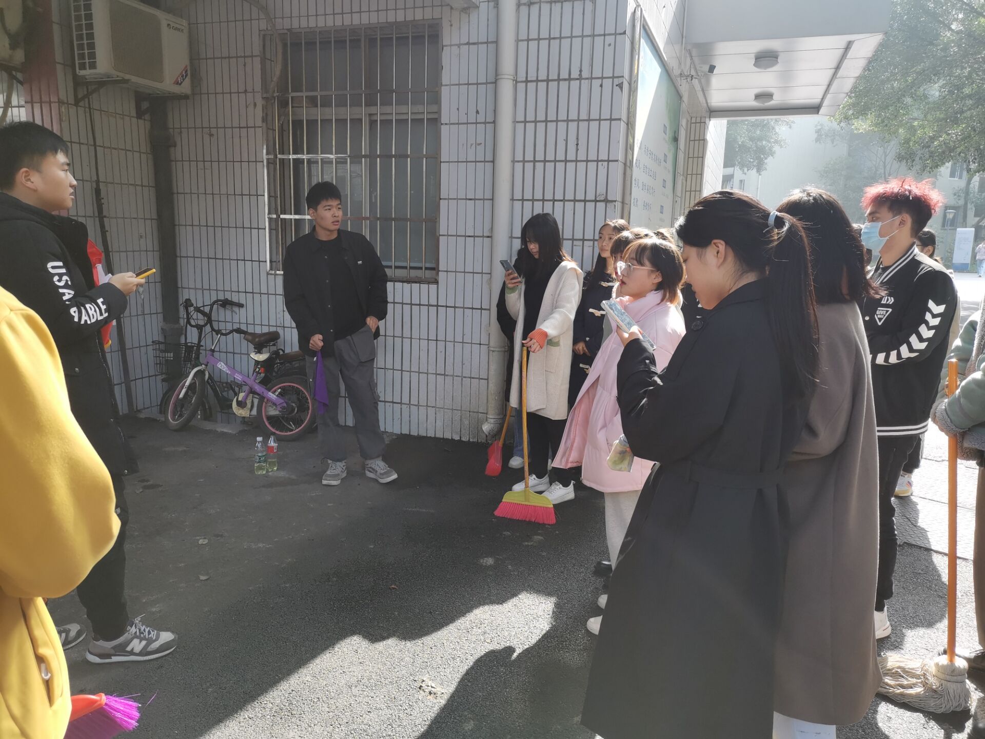 二十余名志愿者在建筑工程学院办公楼楼下集合,集中签到,领取工具,分组分地点开展此次大扫除活动。