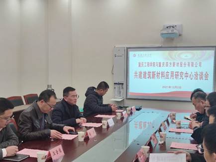 本网讯(文/图 吴俊峰)为了发挥学校与企业联合的优势、整合学校与企业的设备资源、提升学校与企业的科研水平,2021年12月2日10:00—12:00,在学校行政楼第六会议室,我校校长助理简玉刚、建筑工程学院院长雷江等院校领导及专业负责人与重庆四方新材股份有限公司董事长助理卢健、副总裁潘谨等企业领导就共建建筑新材料应用研究中心展开深入地交流与探讨。