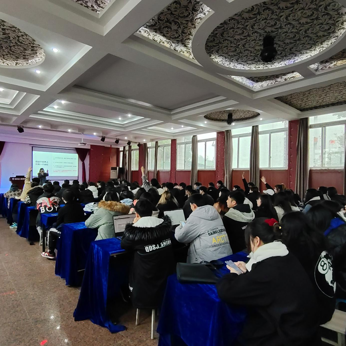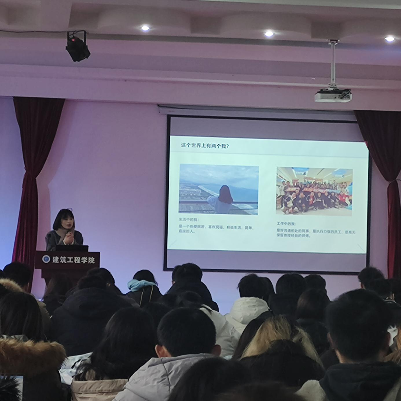 余虹校友通过PPT分享了自己在校经历和工作经历,鼓励学院的同学们走出宿舍,养成良好习惯,多参加社会实践。现场互动热烈,余虹校友邀请建筑工程学院的同学们讲述自己的故事,建筑工程学院的同学们积极参加。