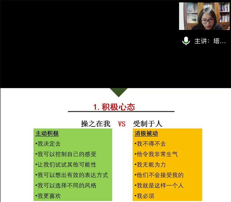 塔怀红老师通过询问“什么是压力、压力好不好、你有压力吗”几个问题来展开讲座,从简单的问答让同学们自测,并进行结果对比,利用几则简单的故事来阐明道理,并让同学们学会如何应对压力和挫折。