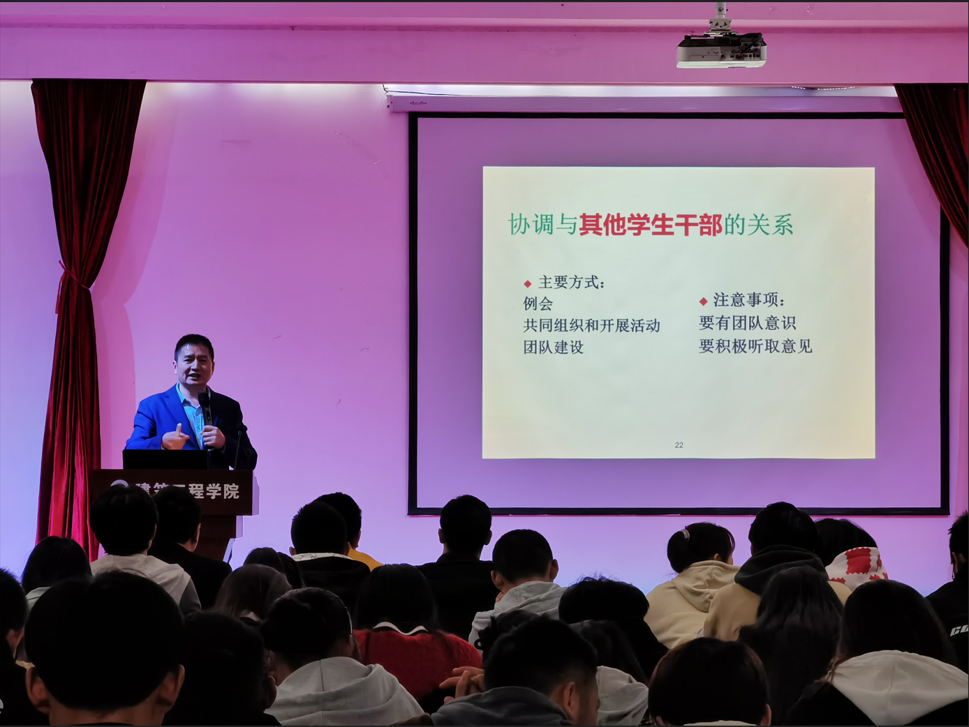 活动伊始,全体学生助理齐唱共青团团歌,同学们的歌声唱出了青春的活力,内心的雄心壮志。唐和平书记为同学讲述如何处理人际关系技巧与态度,要求同学们处理好务实和务虚的关系,养成谦虚的心态。唐书记强调,学生助理在为同学服务时要做到“谦和友善、积极主动以及将心比心”,更要学会协调与其他学生干部的关系,协调与班级的关系。