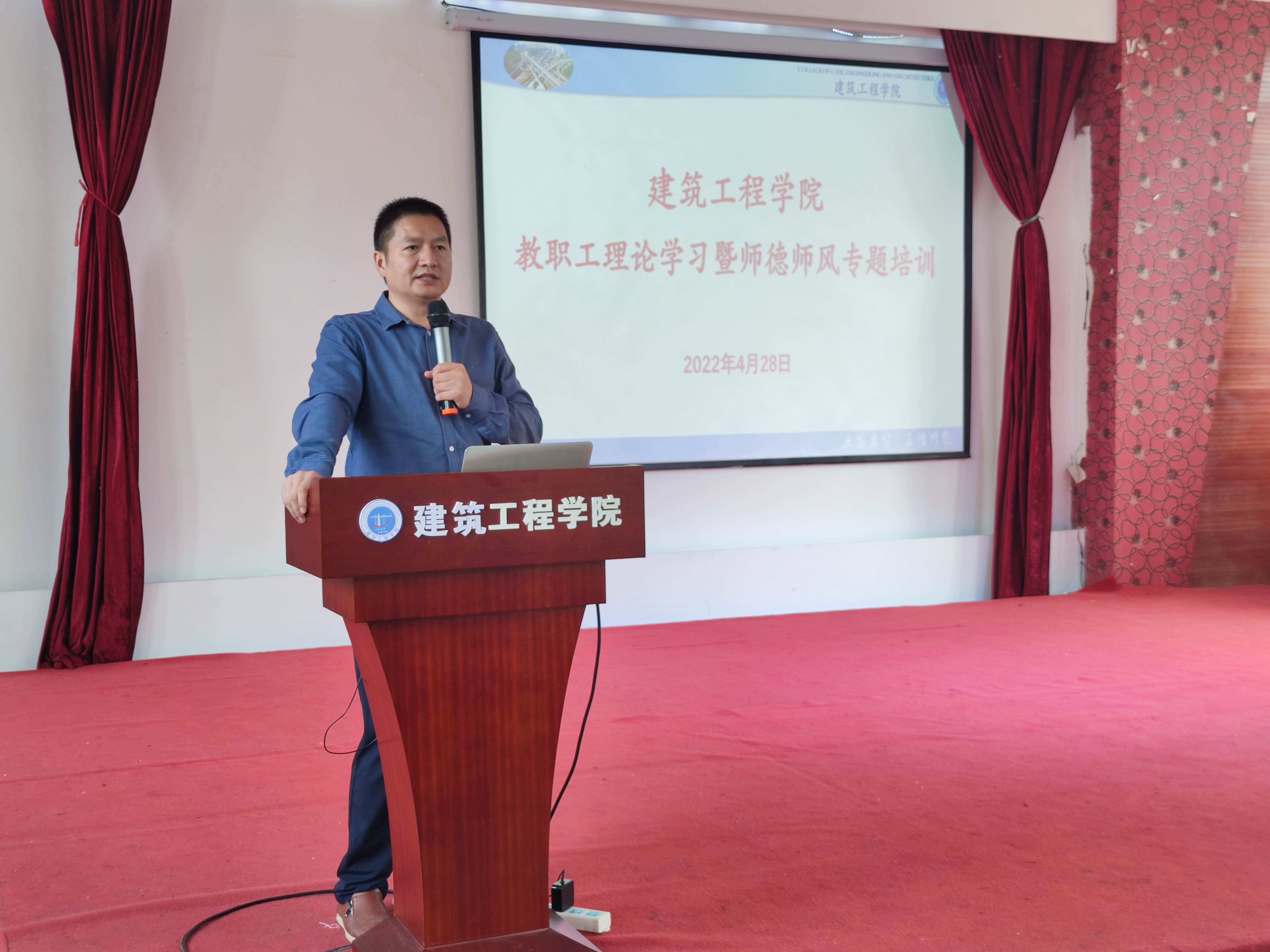本网讯(文/图 吴俊峰)为强化教职工理论素养,加强师德师风建设,建筑工程学院于4月28日在办公楼三楼多功能厅组织教职工进行了理论学习暨师风师德专题培训。党总支书记唐和平主持。