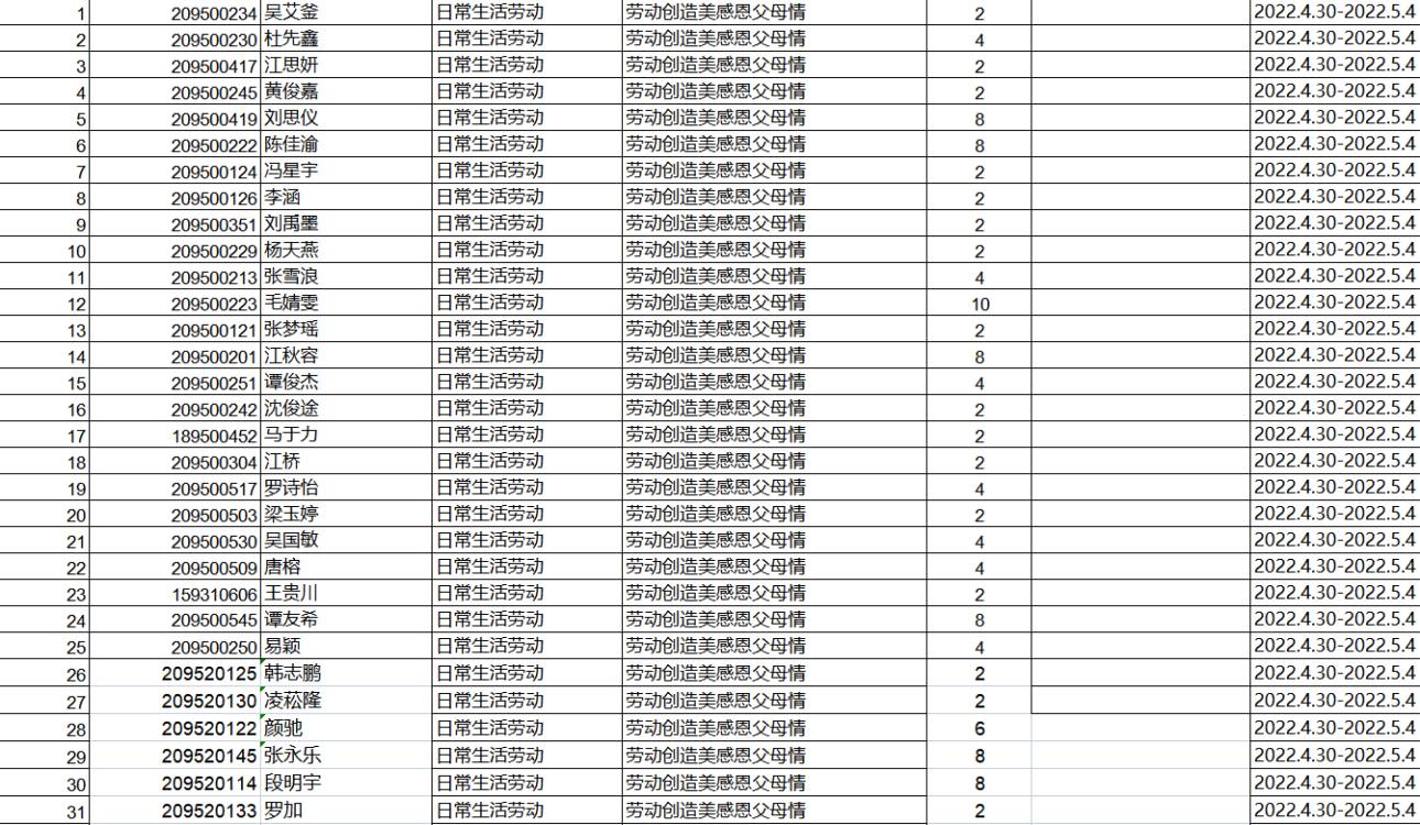 本次活动过程中,同学们在家进行日常生活劳动,例如完成家务整理、美食制作、卫生打扫等,以及深入田间地头,参加农业劳动的生产性劳动,每次劳动后与见证人合照并书写本次劳动心得于活动结束后上传至班长处再由班长汇总转交给各个专业负责人邮箱。
