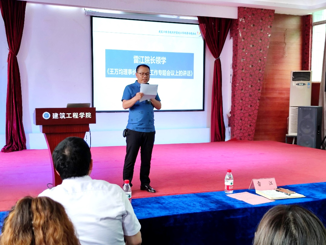 本网讯(文/图 吴俊峰)为提高思想认识,明确工作方向,增强迎接合格评估信心和决心,建筑工程学院于6月17日召开全体教职工大会专题传达学习《王万均理事长在教学工作专题会议上的讲话》(下称讲话)精神。