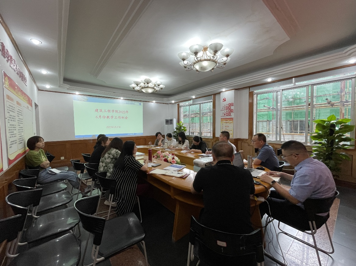 本网讯(文/图 戴晶晶) 6月27日,建筑工程学院副院长汪金能主持召开了学院6月教学工作例会,学院雷江院长、各系主任、教研室主任、教务科人员参加,会议主要是对常规教学工作及迎评整改工作进行具体安排。
