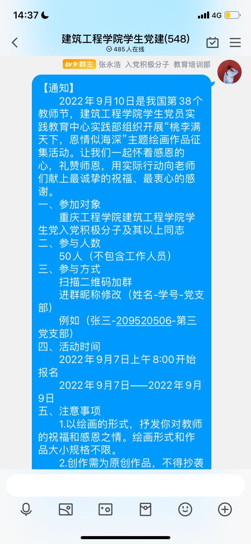 师者,所以传道授业解惑也。教师是立教之本,兴教之源,辛勤耕耘,无私奉献,以赤诚之心,奉献之心投身教育事业。本次活动通过线上宣传通知,同学积极参与,他们以绘画的方式表达了对老师衷心的祝福,赞颂了默默耕耘的教师形象。本次活动弘扬了教师无私奉献的精神、加强了师生交流增进师生感情、营造尊师重教的良好氛围,激发了广大教师工作的积极性、主动性。