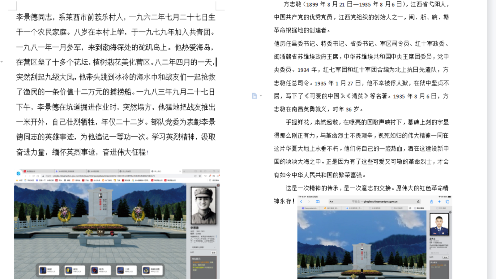 本次活动分为线上扫墓祭奠和书写英雄事迹小短文两个部分。线上文明祭扫,彰显了传统节日时移世易的现代内涵和创新形式,同时也做到了缅怀先烈,弘扬革命精神。书写英雄事迹小短文,让更多的同学了解英雄事迹、祭奠英烈忠魂、牢记初心使命。本次活动同学们积极参加,纷纷提交了自己的作品,充分展示了同学们愿意继承先烈遗志、承担历史责任、践行历史使命的意愿。