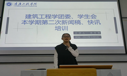 此次会议分为五个环节。第一环节,建筑工程学院团委办公室负责人周密致开幕词,宣布会议开始并欢迎2021级学生骨干的加入,同时对学生骨干们制作活动加分明细进行了培训。第二环节,团委宣传部负责人徐玲琳向学生骨干们详细的讲述了新闻稿、快讯各自的特点和撰写的技巧。第三环节,团委宣传部负责人罗郅涵向学生骨干们简明的讲述了在各类活动中拍摄的方法和技巧。第四环节,主席团成员朱宏佳向学生骨干们简明的讲述了举办活动的各项细则。最后团委副书记(学生)李鹏翔致闭幕词,再次表达对新成员的欢迎和对建筑工程学院团委、学生会未来的展望。会议在一阵热烈的掌声中圆满结束。