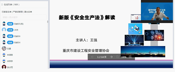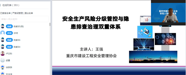 2022年8月22日,重庆市建设工程安全管理协会邀请我院王强教授为2022年重庆市建筑施工企业安全管理人员第7期继续教育培训班开展“安全生产风险分级管控与隐患排查治理双重体系”专题讲座,本次培训由市建设工程安管协会主办,采取线上方式,全市共有约500余名建筑施工单位的企业负责人、项目负责人、专职安全生产管理人员参加培训学习。