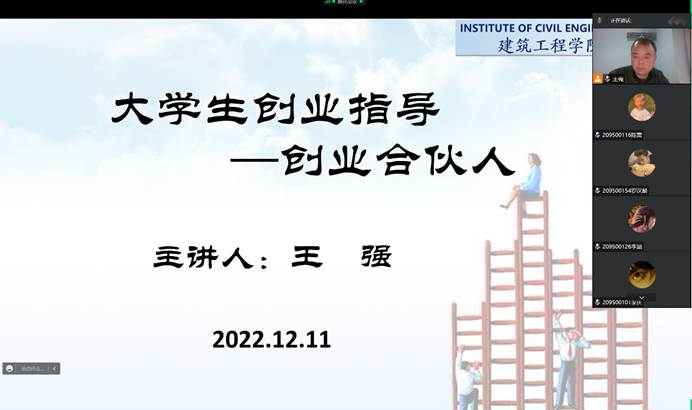 本网讯(文/图 王强)为进一步提高学生的创新创业专业知识,建筑工程学院于2022年12月11日晚19:00通过腾讯会议在线直播方式为全院各年级学生举行了“大学生创业指导-创业合伙人”的讲座。