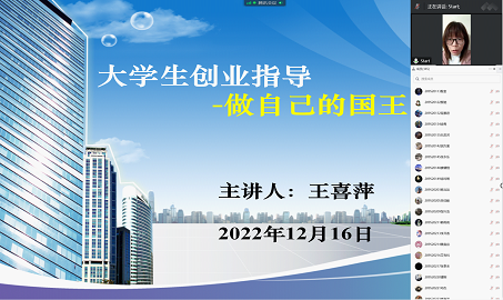 本网讯(文/图 王强)2022年12月16日晚19:00,由建筑工程学院举办的“大学生创业指导—做自己的国王”主题讲座,在腾讯会议在线直播,本次主讲人是重庆凯瑞泽教育信息咨询服务有限公司创始人、总经理,重庆信通工程造价咨询有限公司高级工程师、一级造价工程师王喜萍老师。参加此次讲座的是建筑工程学院各专业对创新创业感兴趣的同学,共计140余人。
