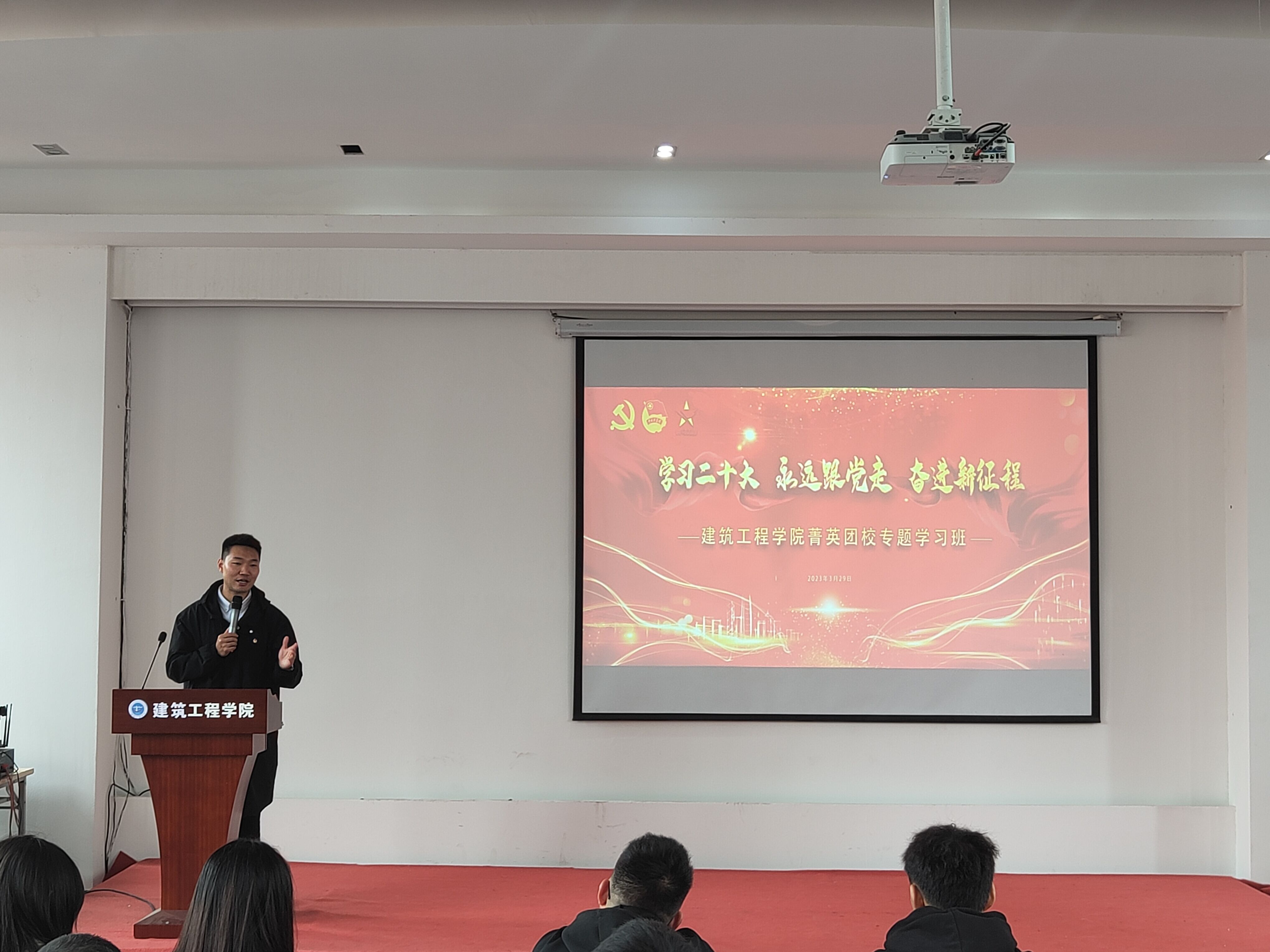 本网讯(文/图 廖梓丞)青马再起航,筑梦新思想。为深入学习贯彻党的二十大精神,进一步引导我院青年学生骨干立足自身实际,深入解读大会主旨与核心。建筑工程学院团委书记金质纯于3月29日中午在建筑工程学院办公楼三楼多功能厅举办“学习二十大 永远跟党走 奋进新征程 ”——建筑工程学院“青马工程·菁英团校”2022-2023学年第二学期大学生骨干培训班,建筑工程学院团委、学生会全体学生骨干参与本次培训。