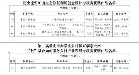 我院兰妮、于建辉、柴盼、毛云莹老师指导的作品分别获得三项第二届重庆市大学生乡村振兴创意大赛历史遗留矿山生态修复利用创意设计专项赛三等奖,窦广陵、陆亚老师指导的作品获得一项第二届重庆市大学生乡村振兴创意大赛“三社”融合如何服务乡村产业发展专项赛三等奖。