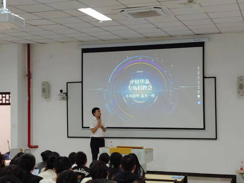 本网讯(图/文 唐茂) 2023年9月25日15:00,中核华泰公司于6203教室给建筑工程学院的同学们做“不负韶华,泰不一样”的中核华泰专场招聘会。本次招聘会为同学们提供了优质的就业机会,为同学们介绍了中核华泰的发展史,使同学们接触到优秀的企业文化,向同学们系统的介绍了“青苗计划”并在现场进行了简历筛选以及对应届毕业生的面试,同学们积极参与。