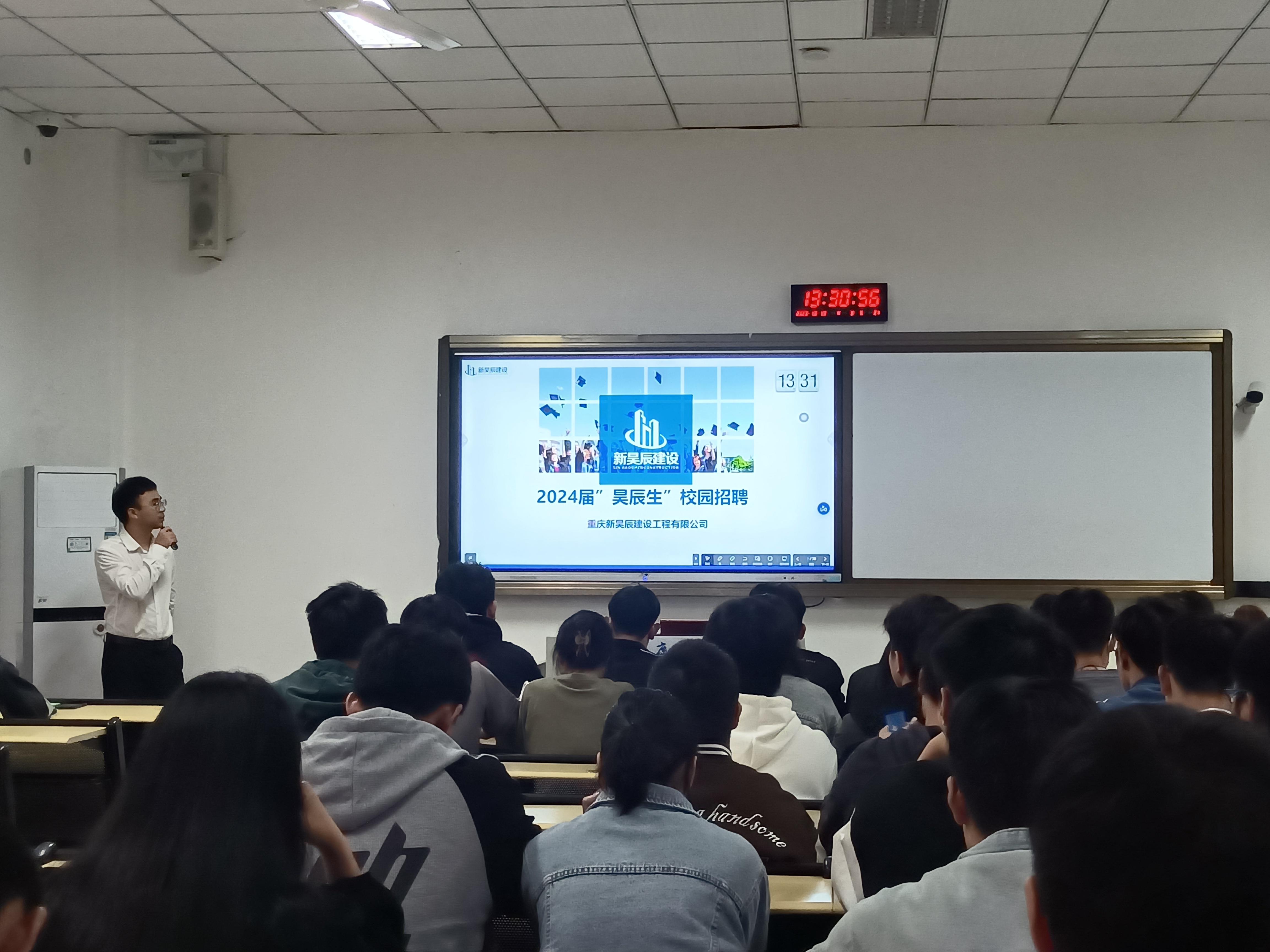 本网讯(文/图 晏麒智)为推动我院2024届毕业生就业工作,进一步加强校企联系与合作,为毕业生求职和用人单位招聘人才搭建平台、提供更好的服务,切实做好学生就业教育。10月19日下午,我校在第六教学楼105教室举办“重庆新昊辰建设工程有限公司”宣讲会,学校就业指导中心和100余名毕业年级学生参加了此次会议。