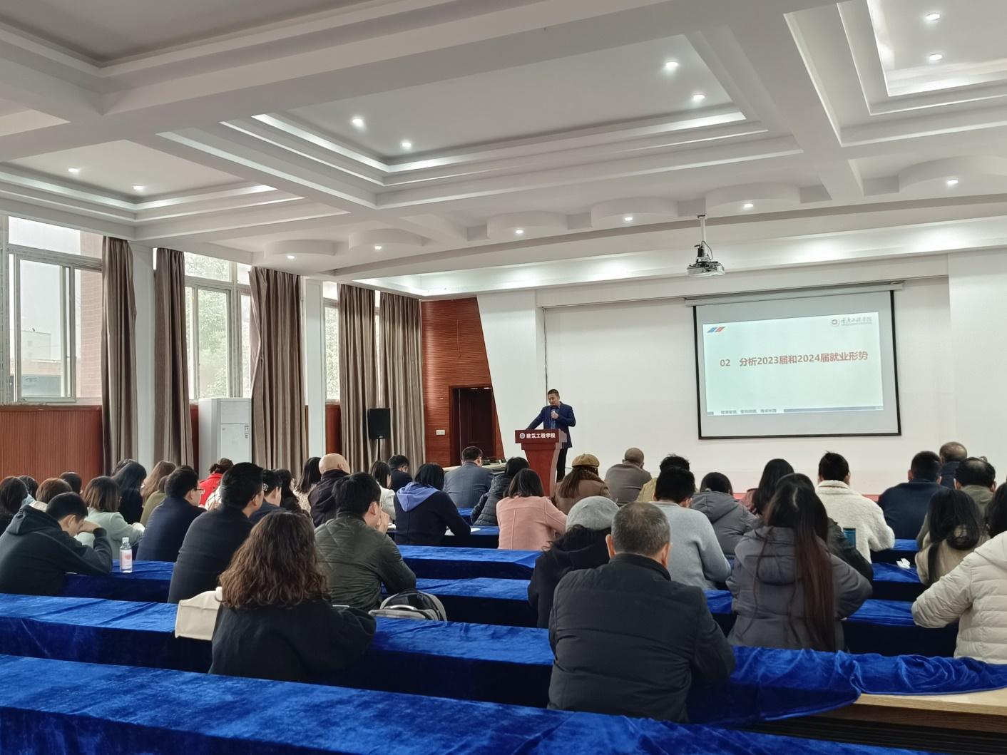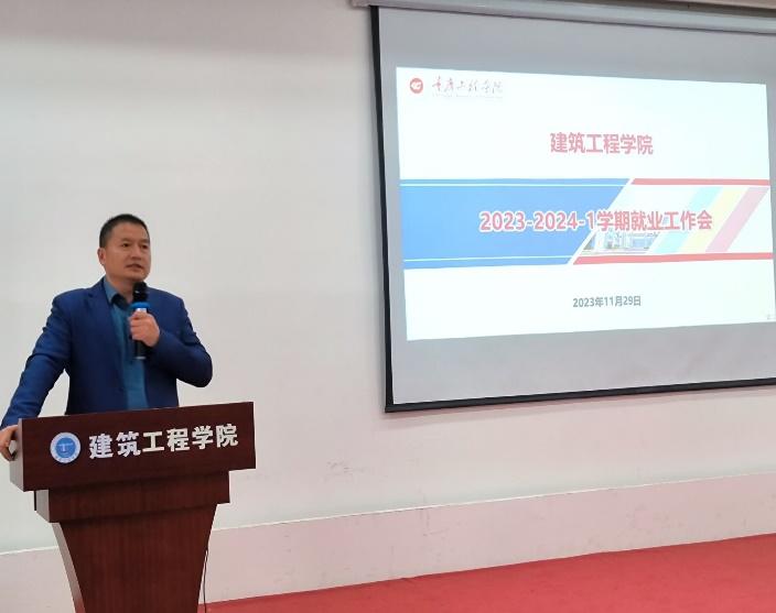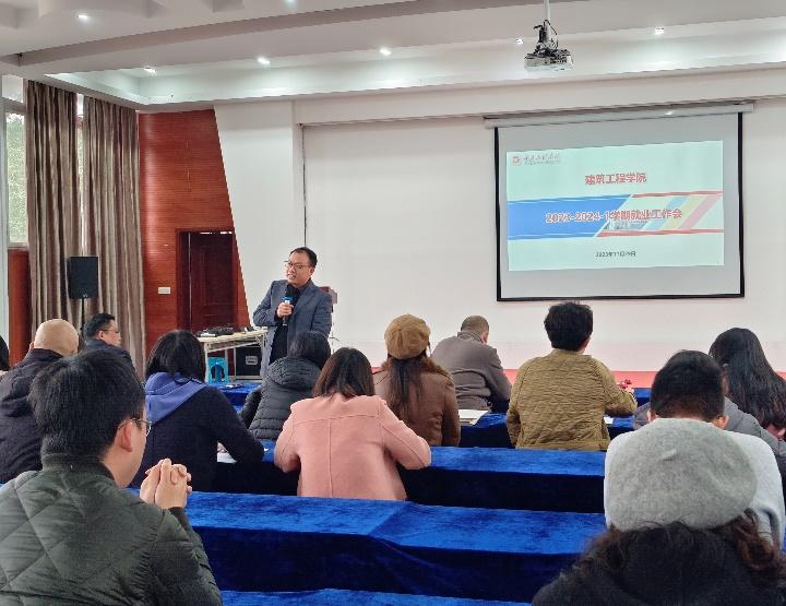 本网讯(文/图 晏麒智)为切实做好2024届毕业生就业工作,进一步提高毕业生就业率和就业质量,深入贯彻落实党的二十大精神,学习习近平总书记关于就业工作的重要论述。2023年11月29日下午建筑工程学院在一教多功能厅开展2023-2024-1学期2024届毕业生就业工作推进会,会议由党总支书记唐和平主持,院领导及学院全体老师参加了会议。