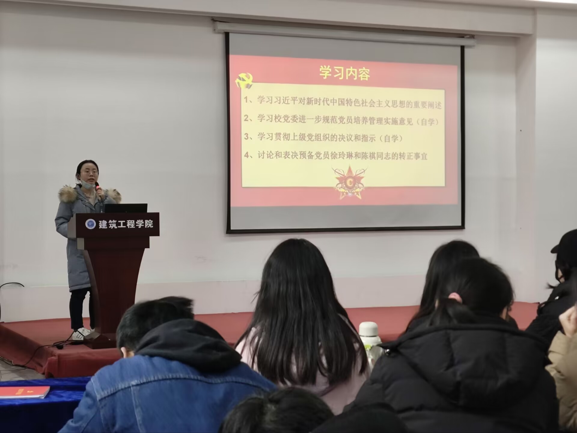 第四项议程:讨论和表决预备党员徐玲琳和陈祺同志的转正事宜。本项议程由建筑工程学院学生第三党支部全体党员共同参与,党员转正流程主要由党支部书记李敏同志负责,对转正的两名党员同志表示成为正式党员后,要在学习、生活、工作等各方面更加严格要求自己,改正缺点、发扬优点,给同学们树立良好的模范带头作用,争做合格党员。会议圆满结束。