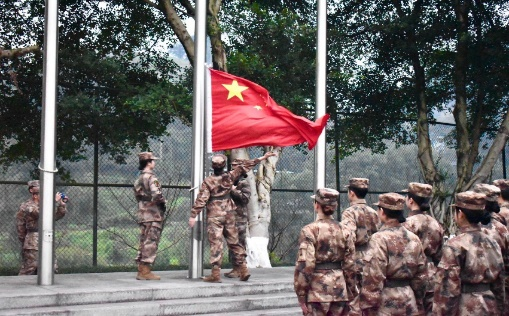 上午7时,参与人员准备就位。7时20分升旗仪式正式开始。第一项议程:升国旗,奏国歌。英姿飒爽的国旗护卫队迈着整齐的步伐,护卫五星红旗来到升旗台,随着雄壮嘹亮的《义勇军进行曲》响起,鲜艳的五星红旗冉冉升起,全体师生肃立,向国旗行注目礼,齐唱国歌。迎风飘扬的国旗,寄托了全体师生对祖国的美好憧憬与祝愿!