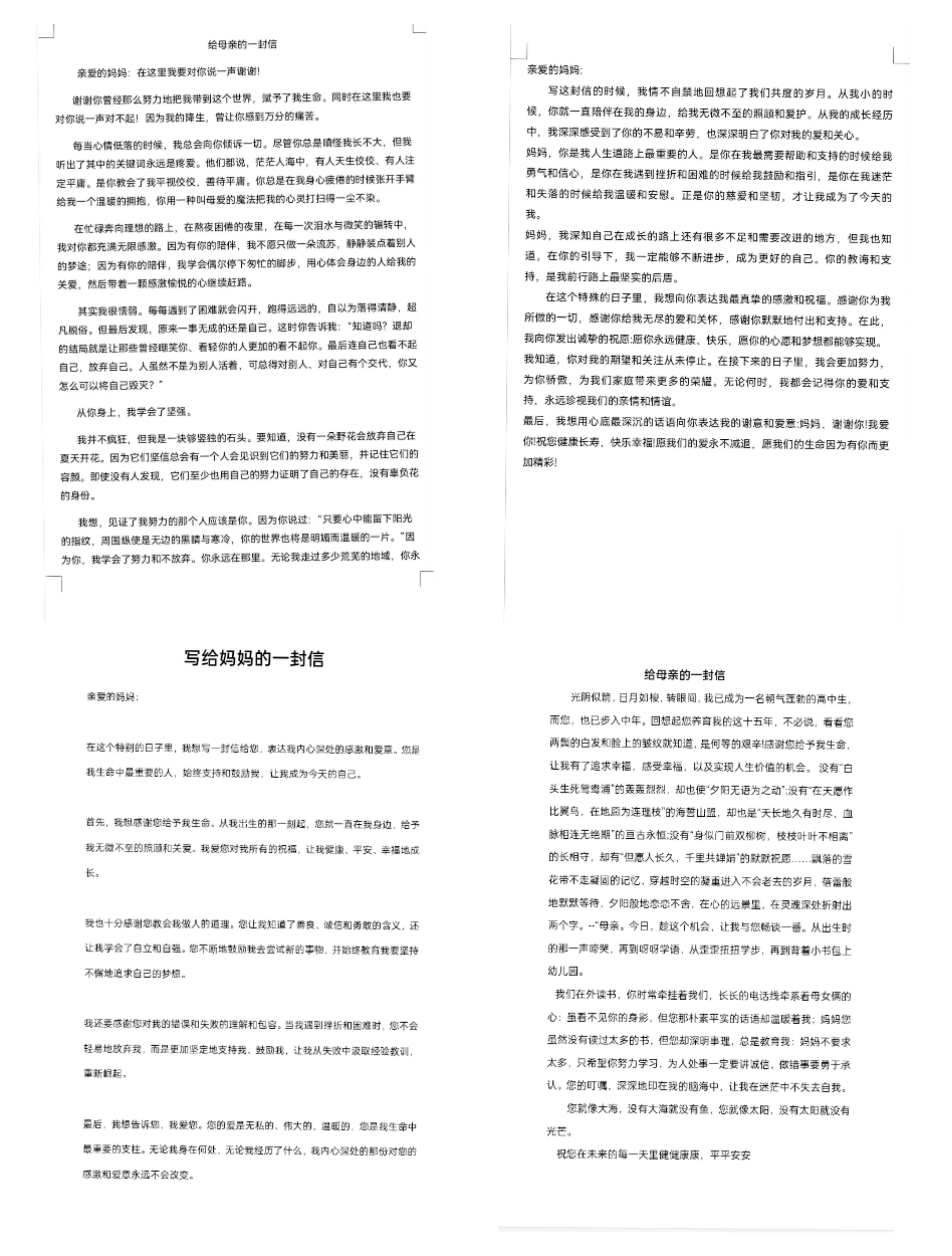 在活动的启动阶段,学生们展现出了极高的参与热情,纷纷响应并加入活动交流群。在活动推进过程中,他们紧扣“心怀感激,歌颂母爱”这一主题,用心书写了一封封感人至深的书信。有的同学在书信中深情描绘了母亲在压力下的坚强与支持,有的同学则在字里行间中流露出对母亲无私慈爱的感激与敬佩。活动圆满结束后,他们将这些充满真情的书信亲手递交到了母亲的手中,以此表达对母亲的深深感激之情。