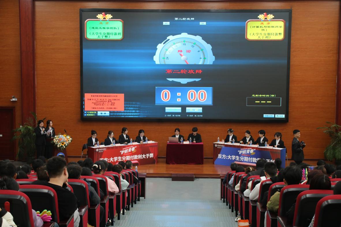 辩论赛决赛在第七教学楼报告厅举行,由我院辩论队及计算机与物联网学院辩论队进行冠军角逐。本场决赛辩题为“大学生分期付款是利大于弊还是弊大于利”。在紧张刺激的比赛中,我院参赛队员经过周密的赛前准备,论据充分,展现出了清晰的思辩逻辑,赢得了现场观众阵阵掌声。