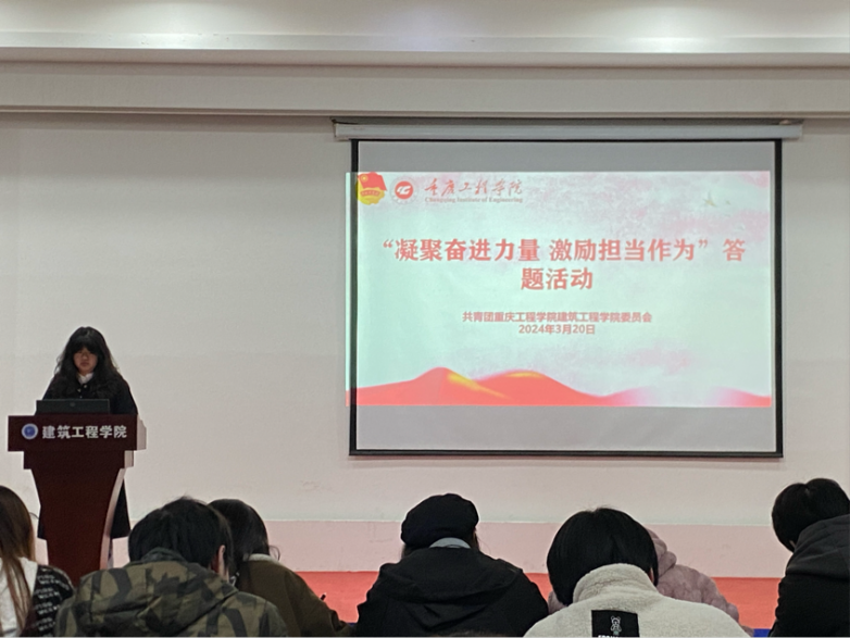 本网讯(文/刘子杨 图/李红碧)为激发建筑工程学院学子的爱国主义情怀,提升同学们的思想素质。建筑工程学院团委宣传部于3月20日晚上在建筑工程学院办公楼三楼多功能厅开展“凝聚奋进力量 激励担当作为”答题活动。本次活动共有50名建筑工程学院学生参加。