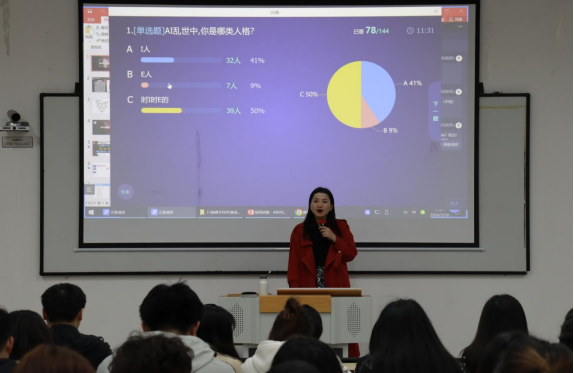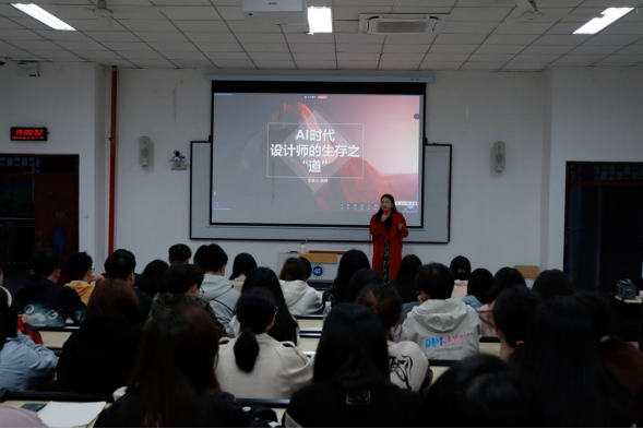 讲座过程中,杨老师简要介绍了本次讲座的背景和目的,向同学们分享了建筑设计行业现状,以“AI乱世中,你是哪类人格”,“你有多了解AI”向同学们提问互动,向同学们详细介绍了AI的运用,结合设计图纸深层剖析以及AI对岗位的影响,结合事例探讨AI的优势。此外,杨老师还为同学们分析了环境设计的就业情况及职业发展路径,让大家更加了解行业,了解未来的发展前景。