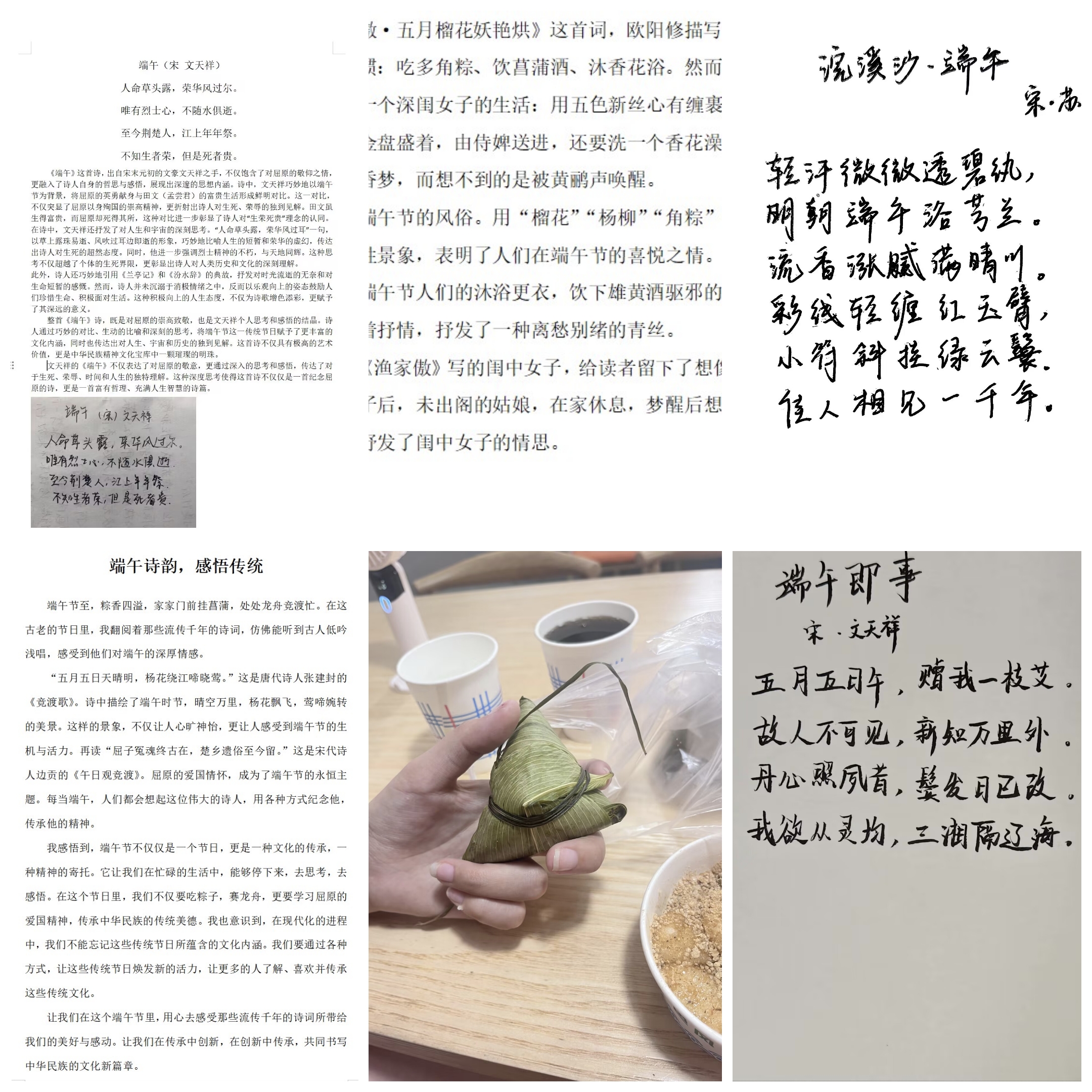 活动自启动以来,同学们便展现出了浓厚的兴趣和参与热情。他们纷纷拿起相机,记录下节日期间观看龙舟竞渡的热闹场面,以及与家人一起包粽子的温馨时刻,通过镜头捕捉到了中华传统节日的独特韵味。这些照片不仅展示了同学们对端午节的热爱,更传递了他们对家庭团聚和文化传承的重视。活动期间,同学们还书写了与端午节相关诗向的感悟,他们用文字表达了对端午节日的祝福和对美好生活的向往,这些文字不仅展现了同学们的文学才华,更加深了他们对端午节文化内涵的理解。