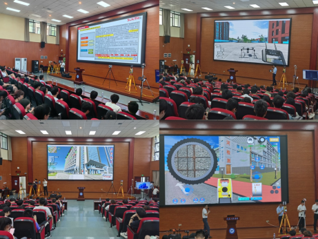 在接下来的专题讲座环节,南方测绘团队在7807报告厅为师生们带来了一场关于“元宇宙虚拟仿真智能实验室”的展示。该部分包括智能测绘、自动化监测、无人机航测以及激光雷达等前沿技术与数字孪生结合后实现的虚实结合实验。南方测绘的技术专家亲自演示了各个实验室的仪器操作和软件应用,并进行了深入的讲解。这不仅让师生们对这些技术有了直观的认识,更深刻体会到了新技术在提升工程行业效率和便捷性方面的潜力。