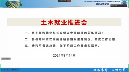 本网讯(文/图 林俊)为进一步贯彻落实学校2024届毕业生就业工作推进决策部署,高质量推动就业工作。2024年8月14日,建筑工程学院土木工程系以腾讯会议的方式召开了暑期就业工作推进会,学院唐和平书记、就业科元云丽科长和系部全体教师参加会议。