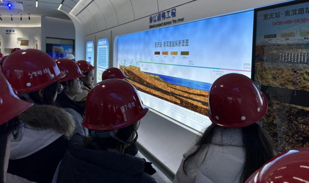 重庆轨道交通27号线土建工程08标段项目部相关负责人段望龙、余世杰、BIM中心负责人蒋中跃带领学生观摩了项目部的电子升降沙盘、数字化展厅、数字化监控中心、线上数字管控平台,学生们在施工现场观摩了智慧工地的现场策划与组织实施,不仅了解了从设计、施工到监测、检测等多个环节的高效管理与控制,也对重庆轨道首次穿江双模盾构施工新工艺、新方法有了初步的掌握。过程中,同学们不时提出问题,企业人员一一进行解答,现场互动氛围浓厚。