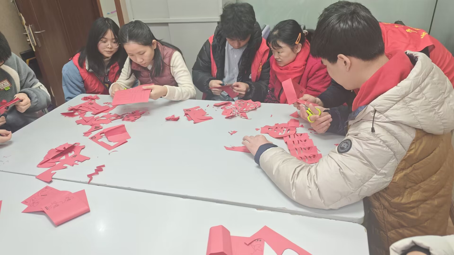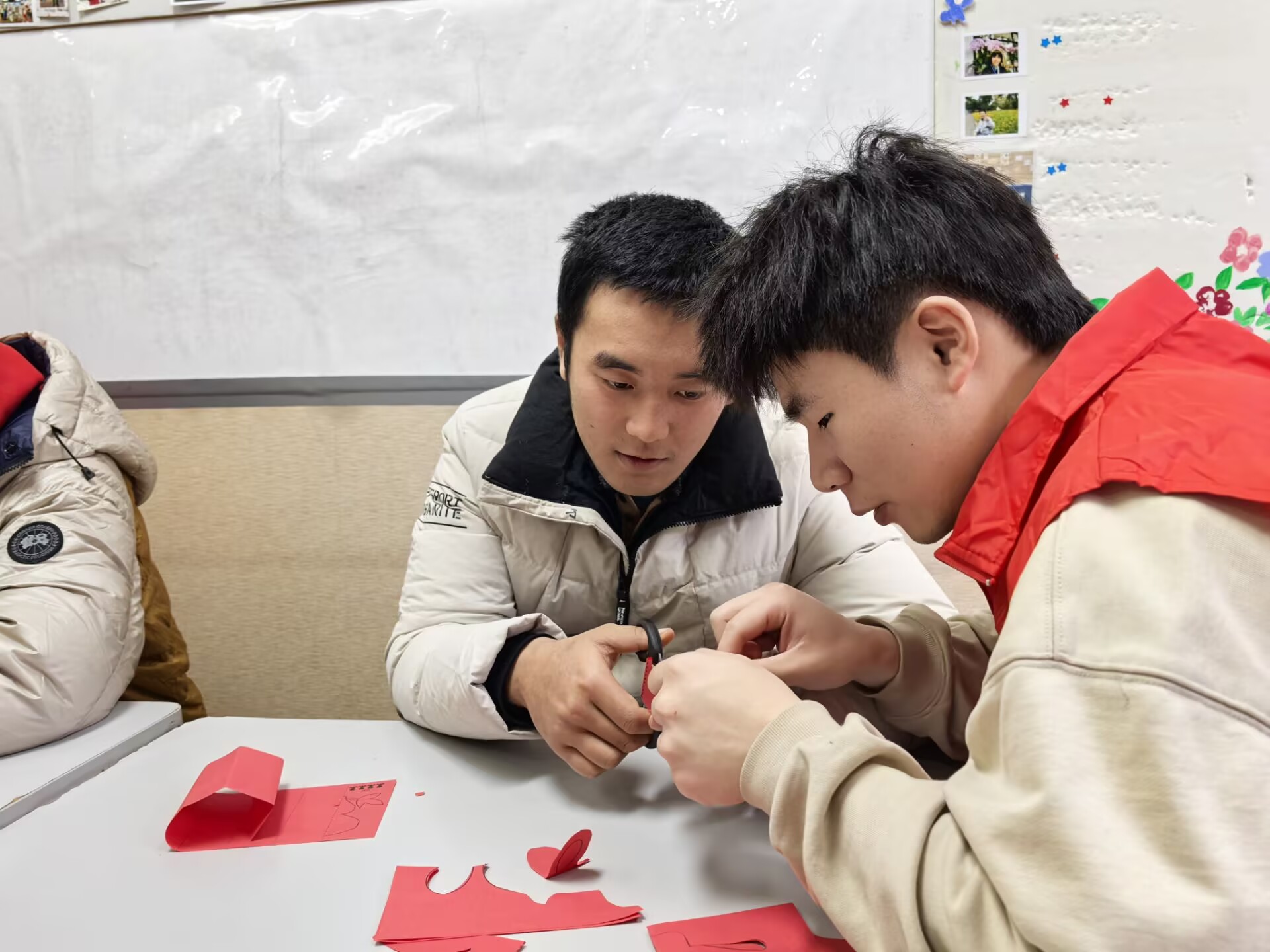 活动过程中,学生党员们带着精心准备的剪纸材料和工具,与“心青年”们一对一结对,共同投入到剪纸艺术的创作中。在指导老师的耐心讲解和示范下,大家从简单的对折、裁剪开始,逐渐掌握了复杂的图案设计和拼接技巧。学生党员们充分展现了他们的耐心与细心,他们不仅认真倾听“心青年”的想法和需求,还积极鼓励他们动手尝试,勇敢表达自我。