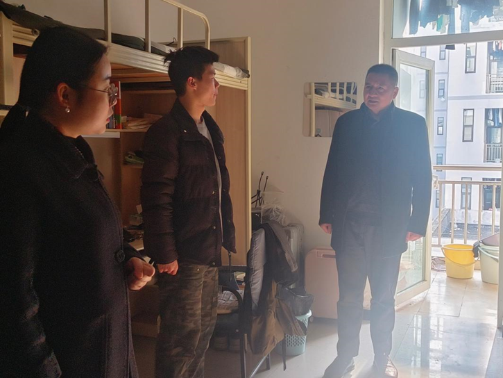 检查小组一行逐层走访,对宿舍内的大功率电器使用、消防安全、清洁卫生等关键环节进行了严格把关。在走访寝室过程中,老师们不仅认真检查,同时对同学们近期学习、生活情况等进行了解。而于个别需要整改的情况,检查小组耐心指导,明确了整改要求和期限,确保每位同学都能够参与到维护宿舍环境的行动中来。唐和平书记特别重申,禁止违规电器的重要性,倡导同学们科学规划复习计划,全身心投入期末准备,展现了学院对学生成长成才的深切期望。