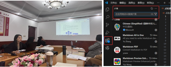 接着,冯梅老师通过现场演示,介绍了VScode软件的细化应用。如:通义灵码、扩展应用Markdown PDF(导出PDF)、Markdown Preview Enhanced(预览文档)、Markdown Kroki(mermaid图)、Markup(转思维导图)等。详细讲解了利用不同的AI软件进行互通的操作步骤,让课堂教学活动变得更丰富,大大提高了教师的备课速度。