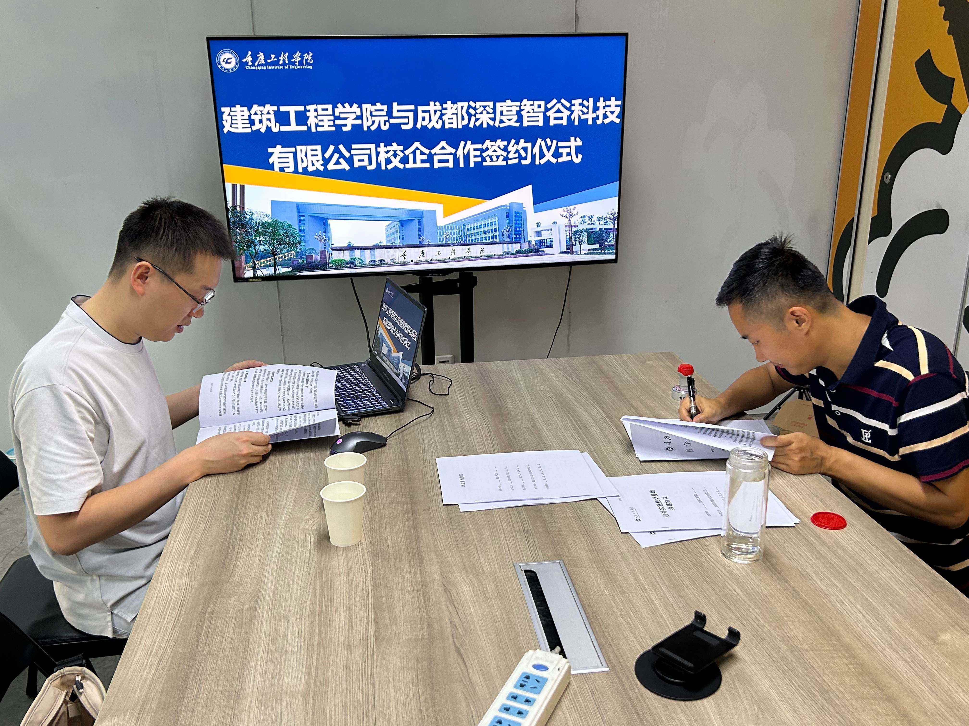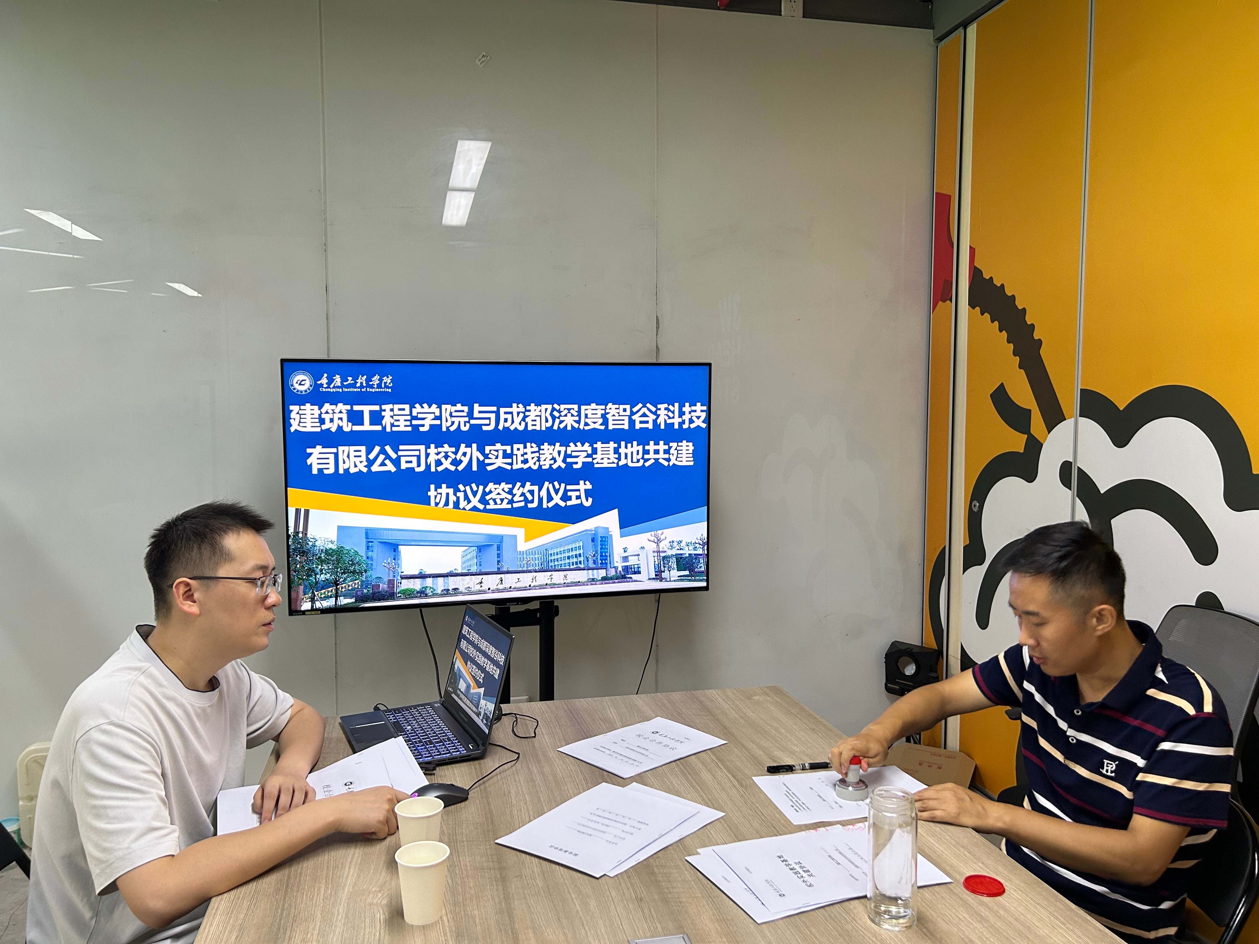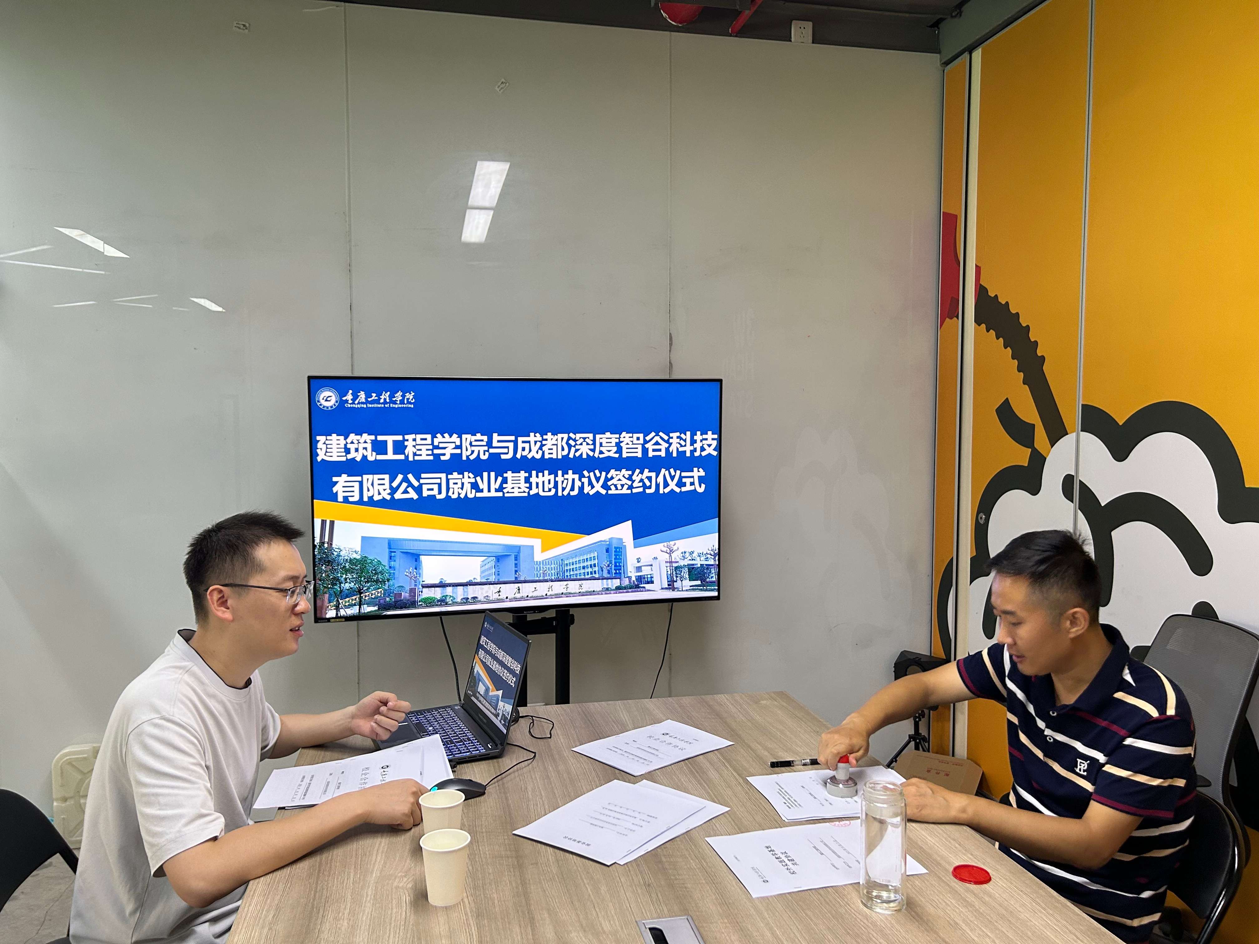 在交流中,谢秋帆老师代表学院与深度智谷签署《校企合作协议》《共建就业基地协议》及《实践教学基地合作协议》。深度智谷作为成都智算中心教学运营核心单位,依托其在人工智能教育、商业项目开发及技术产品研发领域的资源优势,成为学院推进“AI+建筑”复合型人才培养的关键合作伙伴。