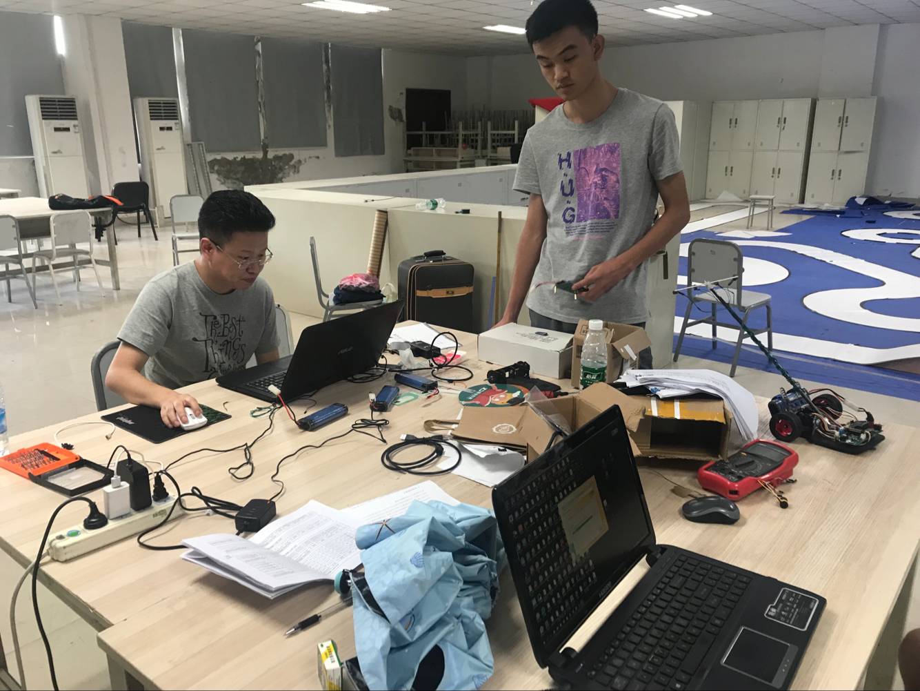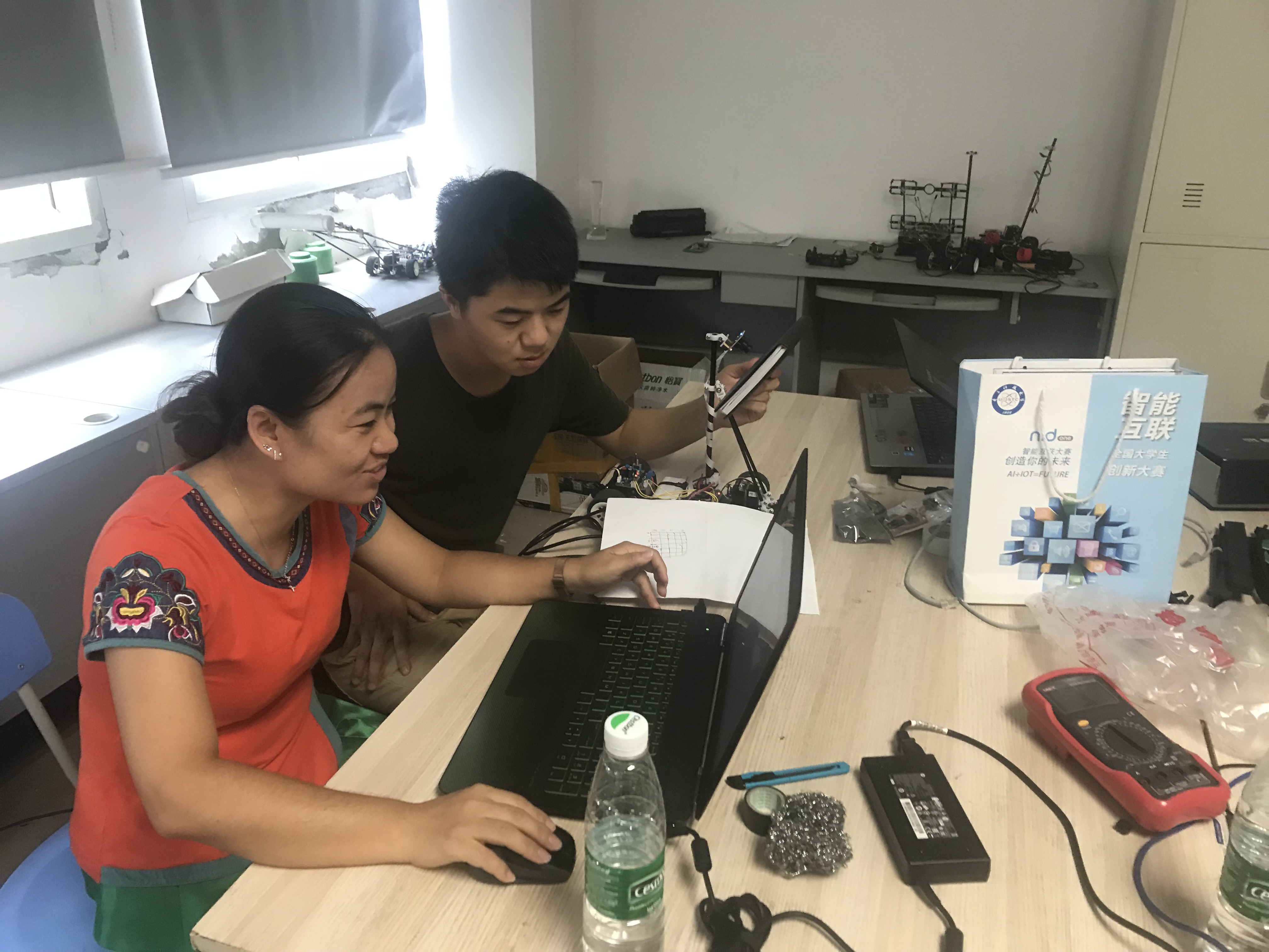 (物联网-宋苗)火热的假期,为了参加恩智浦智能车比赛,物联网工程系叶敏老师、谢箭博士正在实习楼601给学生进行指导!