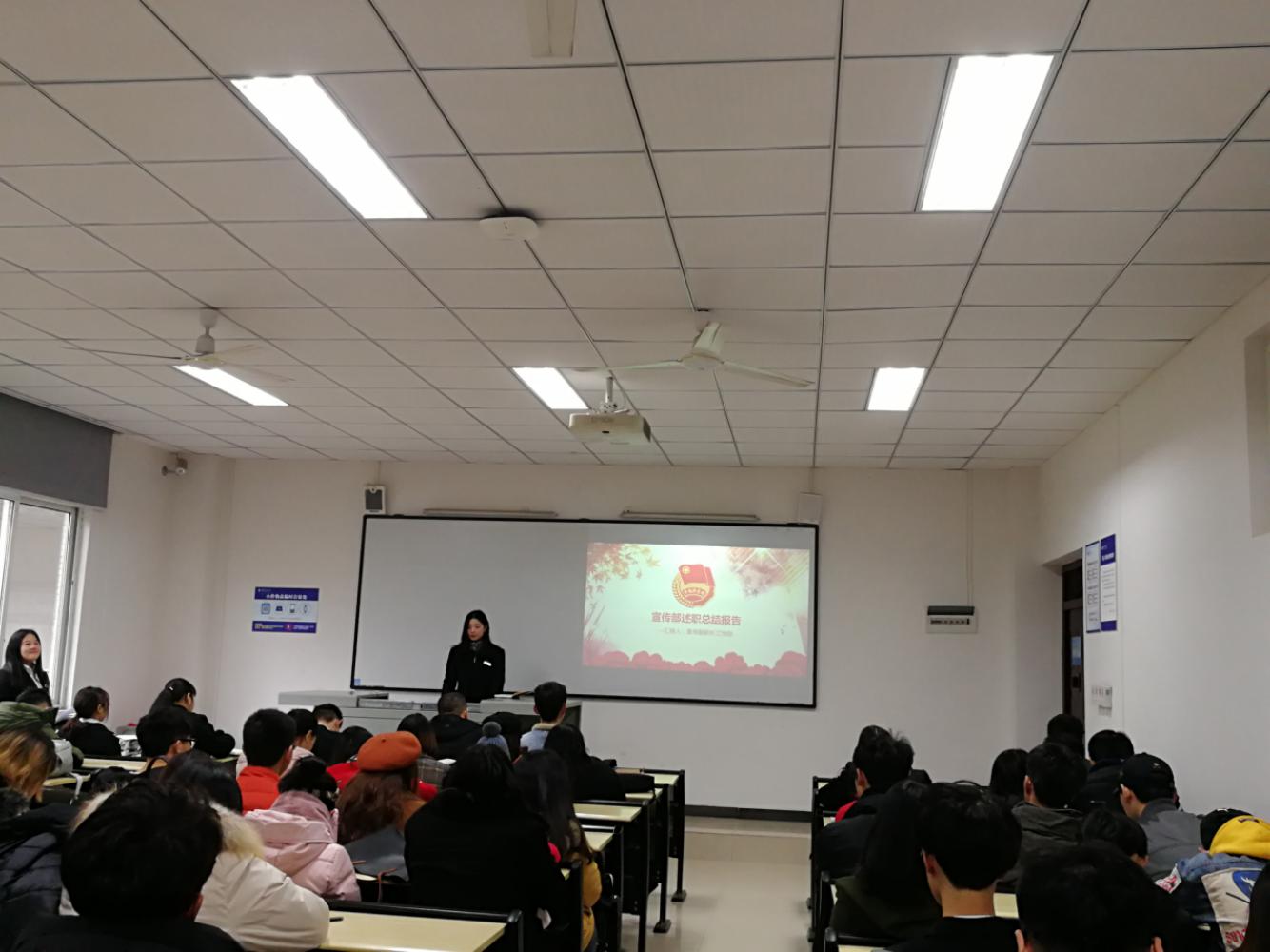(学工办-陈建龙)为向领导和全体学生会成员们展示每个部门的工作落实,推动学院学生会工作长久发展,提高学生会干部工作的热情和质量。计算机学院于2018年12月24日12:40在第六教学楼110教室举行学院团委学生会第一届述职大会。 团学生会各部部长以PPT和演讲的形式对本学期的工作成果进行了展示。学习部在本学期举办了学院之间的辩论赛;体育部举办了我们计算机学院与电子信息学院的“迎新杯”篮球赛,并负责裁判、记录分数等重要工作;文艺部和艺术团正在在紧张的筹备新年晚会等等。学院的各项活动因有每位学生会成员的参与而更加精彩。当然,任何工作都有存在不足的地方,各部门也对存在的一些问题提出了解决措施,并表示将在今后的工作中更加用心的去做、注重细节。 本次述职会议让大家明白要积极的投身于集体当中,积极参与学院下发到部门中的活动,锻炼自身的能力,相信“我付出,我收获,我承担,我成长”。