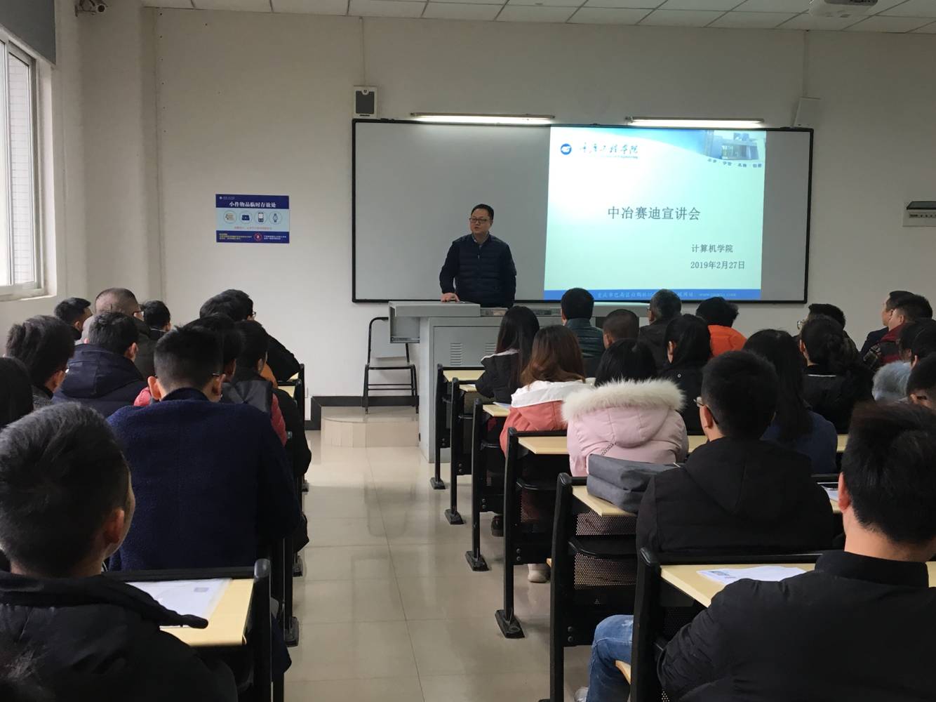 本网讯(文/图 李相霖)2019年2月27日下午3点,计算机学院在第六教学楼107 教室召开了中冶赛迪宣讲会,宣讲会十分荣幸地邀请到中冶赛迪重庆信息技术有限公司信息化室主任林涛,为我院大四应届毕业生作招聘介绍。