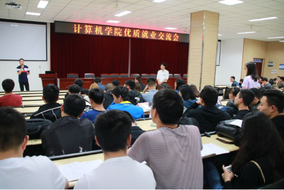 本网讯(文、图/江佳励)为了加强各年级同学与优秀毕业生之间的交流与沟通,帮助同学们掌握更多就业、发展信息,明确在校学习、生活、工作的努力方向。计算机学院于2019年5月13日晚上7:00——9:00在第六教学楼302报告厅开展了“优质就业交流会”。