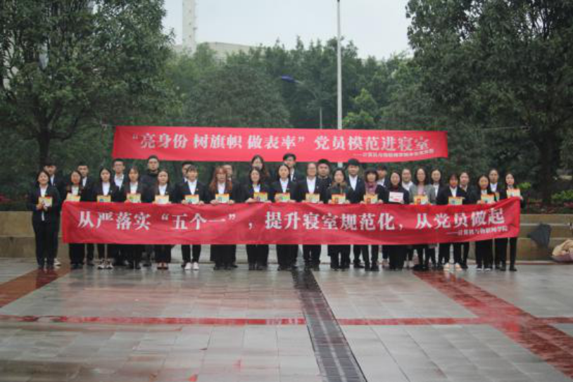 本网讯(文/图 张思琪)为推进文明宿舍管理,落实“五个一”,同时提高党员同志“讲责任比担当,讲奉献比作为”的责任意识、担当意识和服务意识,计算机与物联网学院党总支组织委员梁益建同志、学生党支部书记韩梦杰同志、学生支部组织委员李雯君同志、学生支部全体同志和学院辅导员郑阳春于2019年11月26日下午13:00在和园5号前广场举行党员示范寝室以及党员进寝室的启动仪式。