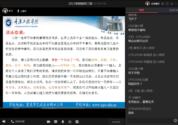 此次班会,老师们认真准备,组织统一观看励志视频、倾听舒缓音乐和经典诗词朗诵,围绕“力克·胡哲”的故事展开讨论,引导同学加深对于生命的理解和感悟。班会放弃了往常的浓重说教味道,充分利用影音视频、集体感悟来提高学生参与班会的新鲜感和积极性,符合同学们形式求变、内容求新的心理,也较好地实现了共鸣的目的。