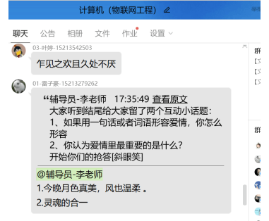对于工科男、工科女居多的计算机与物联网学院的同学来说,在校期间,很多人都将经历人生的第一场恋爱,然而,由于本身人文修养相对较少,又缺乏必要的恋爱观指导,使得很多校园恋情都成为了盲目的无花之果,有的甚至还会受到一生的伤害。为引导和帮助全体同学正确认识爱情,树立正确的恋爱观,从而实现情感的良性发展,并把更多的时间和精力投入到学习和工作中去,计算机与物联网学院于3月15日召开“待到山花烂漫时——大学生恋爱观”主题班会。
