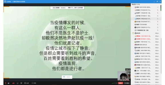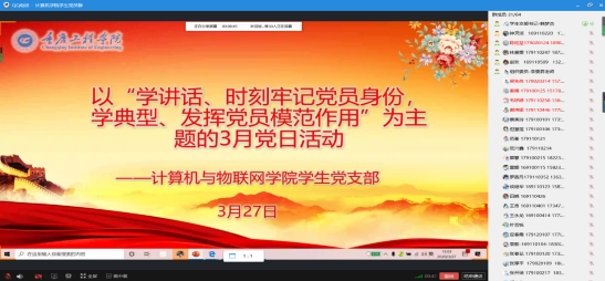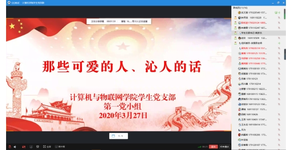 本次主题党日活动以“学讲话,时刻牢记党员身份;学典型,发挥党员模范作用”为主题,以学生党员线上分享疫情期间所收集到的感人事迹的形式展开。本次主题党日活动主要由计算机与物联网学院学生党支部书记韩梦杰主持,计算机与物联网学院学生党支部全体党员、预备党员参与活动。