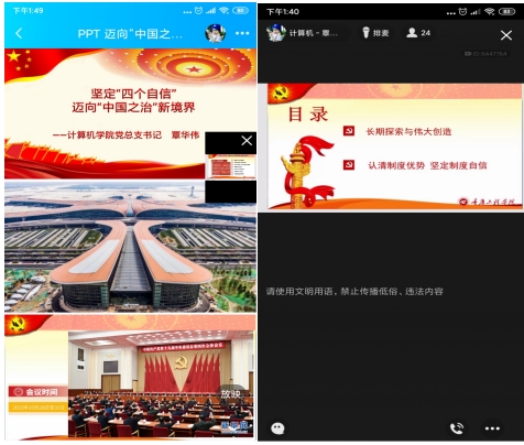 本网讯(文/图 梁益建)4月17日13:30,以“坚定‘四个自信’, 迈向‘中国之治’新境界”为主题,计算机与物联网学院党总支书记覃华伟同志采取QQ群课堂方式为全体党员们上了一堂党课。