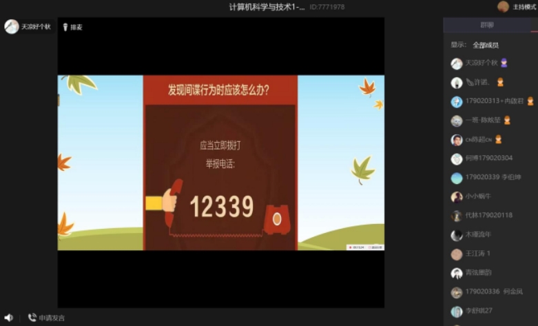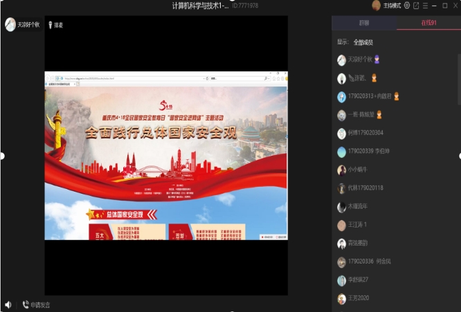 本网讯(文/图 冉啟君)为坚持总体国家安全观,统筹传统安全和非传统安全。我校各组织响应上级组织号召,向学生宣传国家安全、人人有责。2020年4月19号16:00计算机科学与技术专业全体同学于线上开展“第五个全民国家安全教育”活动。计算机科学与技术专业全体同学及辅导员共同参与。