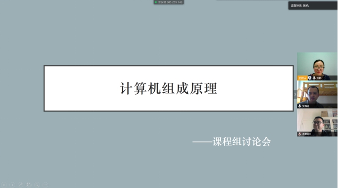 本网讯(文/图 张海涛)2020年6月19日中午13:00,《计算机组成原理》课程组通过腾讯会议平台召开了《计算机组成原理》课程的第三次讨论会。本次讨论会由张峤老师主持,《计算机组成原理》全体授课老师参加。讨论会一共有两个议题,一个是课程实施小结,一个是精品特色课程展示。